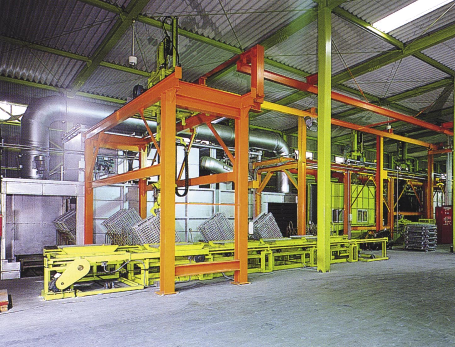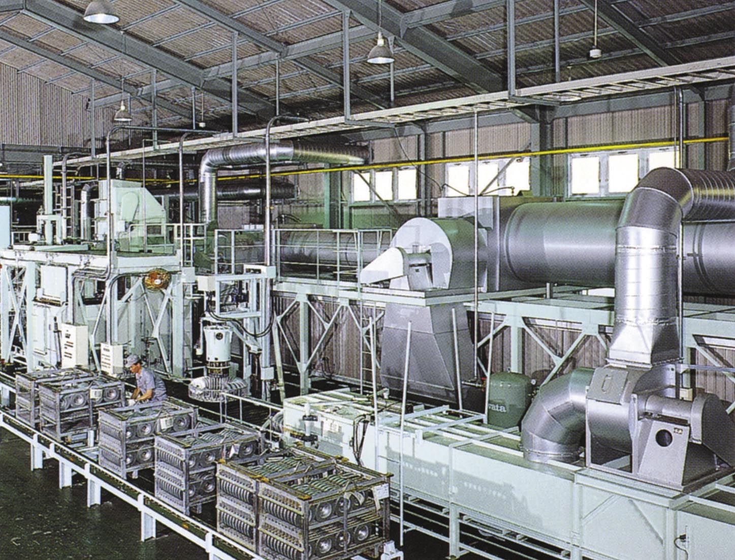 ハンガーに釣った部分を固定タンク中の処理液に浸漬し、オーバーヘッドコンベアー、または台車のハンガーを使って、オーブンで焼き付ける方式です。ディップスピンが基本的に2コーティングであるのに対し、1コーティングのみの塗装で、しかも振り切りが難しいといわれている大型部品の処理を可能にしました。